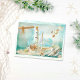 Stunning, aqua sea collage of beautiful beach sand, seashells, toy sailboat, fish netting, lighthouse, and a message in a bottle. Aqua watercolor border in background.