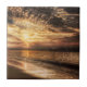 Stunning landscape photograph of sunrise over a beach with a dramatic cloudy sky in contrast to the calm water.