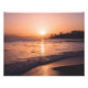 Stunning photograph of a sunset over a deserted beach with mountains and palm trees in the distance.