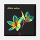 Stunning watercolor-themed digital art design of two plumeria flowers on a refrigerator magnet. The background is a solid black, and the flowers have shades of blue and yellow. The stylish yellow text says, "Aloha oukou" - a traditional Hawaiian greeting which means "Aloha to all of you." You can easily customize and change the wording if you wish. This eye-catching design on a square magnet is sure to attract some attention.