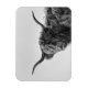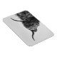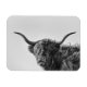 of a sturdy but funny Scottish Higland cow with big horns, long hairs in front of the eyes and the mouth half open in black and white / monochrome.