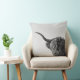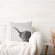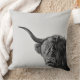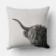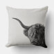 Photo throw pillow cushion with a sturdy but funny Scottish Higland cow with big horns, long hairs in front of the eyes and the mouth half open in black and white / monochrome. Great decoration on your sofa.