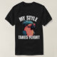 The bird has bright, colorful plumage, primarily in shades of pink and blue, with a black beak. It is wearing large, reflective sunglasses with a pink tint, giving it a trendy and fashionable appearance. The bird's feathers are spiked up in a dynamic and edgy style. Surrounding the parrot is bold, white text that reads "MY STYLE TAKES FLIGHT," emphasizing the parrot's cool and confident demeanor.