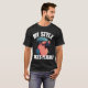 My 11 yo wore adult XL (5’7” 165#). The 8yo is small framed. She wore adult small and tied it in the back. Grandma wore adult large with long sleeve shirt underneath. Tall girl adult medium. Dark haired male adult large. Good quality dark Heather gray, Gildan brand shirt. -it was next up from basic choice and cost about $20 per shirt. Not too thick or thin. Washed and dried well, no major shrinkage. Not see-through. Can wear a bra under it fine. Screen print is just as shown and well done, front and back.
