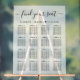 Stylish wedding seating chart frosted acrylic sign for up to 16 tables featuring "find your seat" in a chic script and your names and wedding date joined together by a heart in simple modern typography.
