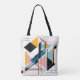This tote bag features a striking geometric abstract design, combining sharp angles and clean lines with overlapping shapes. The color palette consists of pastel hues like soft pink and light blue, contrasting with bold accents of black and mustard yellow. The arrangement of various rectangles, triangles, and lines creates a dynamic and modern aesthetic, reminiscent of abstract art movements such as Bauhaus or De Stijl. The design has a minimalist yet bold feel, making it perfect for someone looking to make a subtle yet stylish statement. The black straps complement the design, adding a sleek finish to this contemporary tote bag.