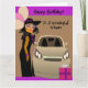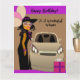 This card features a stylish African American lady wearing a black dress, hat, glasses, while standing beside a champagne car. Get this cute card for your friend, relative, or co-worker.