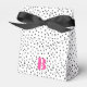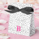 Stylish favor boxes featuring a bold pink initial and an all over tiny polka dot pattern in black.