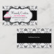 Pretty bakery business card done in a black and white damask, with black bold band, across the middle, and a decorative black edged white text area, on the front. Whimsical graphics of pink, white, and black cupcake decorates the left side, of the card. Text is fully customizable to suit your business needs. Great for at home bakers too.