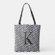 Add personalized style to your accessory bags and purses with a custom-made tote bag. Stylish Black White Chevron Zig Zag Stripe Monogram Tote Bag. Great gift idea.