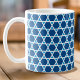 Stylish coffee mug with a classic geometric star pattern in blue and white.