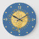 Lovely wall clock done in a federal blue, with yellow numbers and dots. Graphics of a pretty yellow scalloped disk, in the middle is surrounded by yellow and gold tone dots. A elegant yellow glossy looking flourish decorates the middle. Great for any room of the house or office and makes a pretty house warming gift.