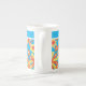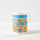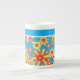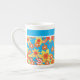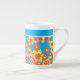 A very stylish Bone China Coffee Mug, with an all-over pattern of red, orange, yellow flowers on a bright turquoise background, from a handpainted paper collage by Judy Adamson. You can add text to the plain band at the top or just leave it plain.