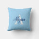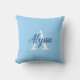 Stylish Calm Blue Monogram Script Throw Pillow featuring an elegant arrangement of name and monogram initial on a light blue background. The pillow is easy to personalize by typing the name and monogram initial of your choice into the online personalization template before ordering. The text automatically copies across to the other side of the pillow to show the identical name and initial on each side.
