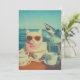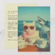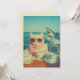 A cool cat wearing pink sunglasses and a scarf enjoys tea at a seaside table while a dramatic shark leaps from the ocean in the background.