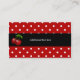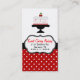Stylish bakery business card done in red, black, and white, with red and white polka dots, on the bottom front and covering the back of the card. Sweet graphics of a polka dot cake, with cherries on top, decorates the top front and a black and white decorative text frame is in the middle. Cute red cherries decorate the black text band, on the backside of the card. All text front and back is ready to personalize for your baking business.