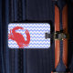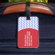 Stylish Summer fun luggage tag done in a blue and white trendy chevron pattern. The front of the tag has a muted red colored silhouette of a crab, and the back has a circular red text area, on the left. White text is ready to personalize. Great for luggage and more.