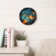 Stylish cosmic galaxy clock. Striking wall art Clock in various shapes and sizes. Beautiful world amongst the stars with cool green blue tones and a warm pop of vibrant yellow and orange shades.