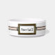 Stylish cat food dish, with pretty graphics of a pink, black, and tan ribbon, around the dish, and a metal looking name plate, in the middle for your pet's name. Black custom text allows you to customize with your pet's name, for a personalized bowl your pet can be proud of. Makes a great gift idea.