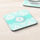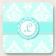 Pretty monogram coasters, with a light aquamarine and white damask background. A bold aquamarine stripe runs across the middle, with a decorative round disc, in the middle, for a one letter monogram. Personalize the initial to suit your needs. Great gift idea.