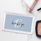 This trendy modern business card case features a monogram and first name in black and white script on a stylish dusty blue background.