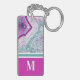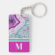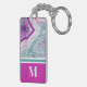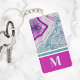 Stylish Teal Magenta Pink Agate Stone Monogram Keychain. Agate crystals and geodes continue to be a favorite trend! This print features and up close image of a teal or turquoise and purple pink or fuchsia geode stone, complete with little crystals and white banding. Accented with vibrant color blocking to give it a modern and trendy look. Add your initial to make it your own.