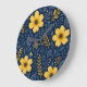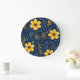 This beautifully arranged wall clock showcases a classic Mediterranean botanical flower design, Featuring a vibrant pattern of yellow, orange, and dark blue flowers and leaves. The design is ornate, stylish, and eclectic, making it appealing to artistic crafters and enthusiasts of vintage retro styles. It is available on a variety of modern decor products such as fleece blankets, lamps, and bedding.