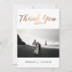 Stylish wedding thank you postcard template featuring a photo on the front with the text "Thank You" in a modern script font in faux shiny gold. There is a small foliage illustration under the text in faux gold as well. Custom thank you message on the back of the card. Elegant and modern design.