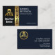 A vertical faux gold stripe demarcates a black and blue layered cover. ; Inside the gold piece lies the contact details. To the left of this is a gold chauffeur logo you can use with the business name "Chauffeur Service". At the top you can find your prestigious name, the job title and a slogan caption option at the lower right corner. You can change the caption remarks to the slogan to suit your own service needs.