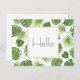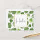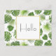 A hello postcard with a pretty pattern made up of green tropical leaves. Exotic and stylish design.