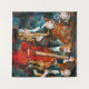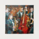 Stylish jazz band playing music on the scene, background is brown. Palette knife technique of oil painting and brush.