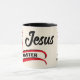Stylish JESUS Christian Easter Mug with CUSTOMIZABLE TEXT. The design shows a combined heart and cross in red and black and bold black typography against a pale cream background. The word EASTER is CUSTOMIZABLE (9 letters max) and you can ADD YOUR NAME in the bottom right hand corner. This inspirational Christian Easter mug would be a great gift to share your Christian faith with your family, friends, colleagues and clients for Resurrection Sunday.
