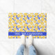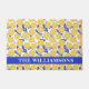 This stylish personalized doormat features a simple illustration pattern of yellow lemon slices and cobalt blue floral shapes. Great gift idea!