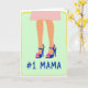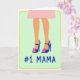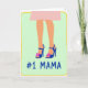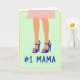 Designed with a modern, graphic look, this card centers on the lower half of a woman, posed with a graceful stance that suggests affection and admiration ❤️. A pale pink skirt falls softly above slender, peach-toned legs, drawing the eye down to cobalt blue high-heeled sandals. Thin straps wrap the feet, and each sandal is decorated with a fuchsia flower topped with a bright yellow center, like a small bouquet carried into the scene 🌼. The background is a light mint green field that keeps the focus on the outfit while feeling calm and airy. A sunshine-yellow border frames the illustration with a sunny, hand-drawn feel. Along the bottom edge, the text “#1 MAMA” sits in deep blue lettering, standing out clearly against the mint background. The skirt hem curves gently above the ankles, while the blue heels angle slightly outward beneath the flower accents.