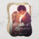 This modern and elegant holiday wedding announcement card features a 'Married Christmas' stylish calligraphy script with sparkling stars on a full bleed photo. The back of the card has a faux gold foil image background with white snow dots pattern.