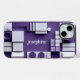 This stylish and modern cellphone cover showcases a geometric, three-dimensional design set against a rich purple background. The cover is adorned with an array of raised, white shapes, including squares, rectangles, and circles, creating a visually striking pattern that contrasts beautifully with the deep purple. Your name is elegantly displayed in a vertical orientation in the center, adding a personalized touch to the design. Replace the name or delete it. The combination of sharp geometric forms and bold colors gives the cover a contemporary and artistic appeal, perfect for those who appreciate a sleek, minimalist aesthetic with a unique twist.