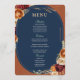 Stylish modern autumn orange navy floral wedding Menu. Elevate your wedding reception with this stylish modern autumn wedding menu, featuring a sophisticated blend of warm orange and deep navy florals. Perfect for an elegant fall celebration, this menu card beautifully displays your carefully curated meal details while adding a touch of seasonal charm to your tablescape. A chic and timeless addition to your wedding décor!
