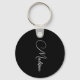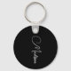 A simple, stylish, script name keychain with white typography on black. Minimalist style.