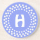 Stylish monogram stone coasters, with a dotted white design, on a blue background. The graduating dots form circles around the middle monogram text area. Personalize with the letter of your choice. Great coasters for any room of the house, and a set would make a lovely gift for any occasion.