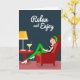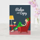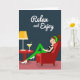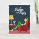 This card shows a stylized illustration of a young woman lounging in a plush scarlet armchair, her crossed legs in emerald-green pants and white heels giving the scene an easy, confident charm ❤️. She wears a black sleeveless top with a slim white stripe, and a matching green headband holds her dark hair in a tidy bun as her closed eyes and rosy smile suggest a cozy, content moment. Beside her sits a small round side table in a similar red tone, adding balance and a hint of friendly togetherness, like she’s waiting for someone to join her. On the tabletop, a mid-century style lamp with a sunny yellow shade trimmed with small orange dots casts a warm, welcoming accent. A slender stemmed glass holds a golden drink with a bright yellow straw, adding a light, social touch 🌼. The background is a deep blue-grey that makes the reds, greens, and yellows stand out without feeling busy. Near the top, the phrase “Relax and Enjoy” is placed in white lettering, centered above the chair. The lamp’s yellow shade has an orange dotted border, and the drink’s straw is a clear yellow line angled slightly to one side.
