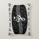 A stylish musical design in gray, black and white with a large treble clef in the center with curved piano keys creating a border at the top and bottom of the design with a subtle pattern of gray musical notes in the background. An eye-catching music gift for the pianist, music lover or musician.