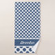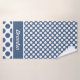 A stylish blue and white polka dot pattern with a name decorate the bath towels. Modify the fill color and the name to personalize the young birthday gift. Additionally, change the name into initials, change the font, font color, or font size. Please remember to alter the shape hue too. For help with color and design customization, contact https://t.me/KBMD3signs_chat.