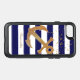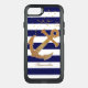 Stylish nautical themed Otterbox brand iPhone 5S case done in a navy blue and white striped background, with gold tone glittery confetti, at the top. Graphics of an golden glitter looking anchor sits askew, in the middle of the case. Personalize the text to read what you want.