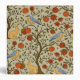 Seamless pattern featuring stylized orange apples on brown trees, blue and yellow birds, and yellow rabbits against a tan background.