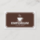 A stylish business card template designed for a coffee shop. The card has a large framed panel on the front containing a generic coffee cup logo/symbol with the company name and type of business beneath. The reverse side of the card has a strait ribbon style header with the company name and business type repeated in the header. The lower section has the address at the top with opening times in the center, with telephone number beneath and the email and website addresses at the bottom. This template allows plenty of space for longer names making it easy to customize with your details, but can also be additionally customized.