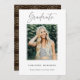 Stylish graduation announcement card featuring the graduate's photo with "Graduate" in modern script. Personalize the photo by adding the graduate's name, school name, and graduation year. The reverse side features an abstract golden circle pattern on a brown background. The reverse side background color can be customised.