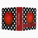Pretty teacher's custom class planner binder, with graphics of a a red patterned apple against a black and white polka dot background. Digital graphics of a red ribbon and bow, stretches across the bottom front of the binder. The spine is done in solid red, with custom white and black text. Personalize the text to say what you want. Great as teacher's planners or grade books. Makes a great gift for your favorite teacher. Purchase the inserts you need separately from office supply stores.