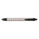 Stylish pen with a colorful geometric pattern on the barrel. Contrasting black and silver parts, shown from front and bottom views on a white background.