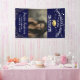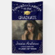 A stylish 'Congratulations to our Graduate' door banner, featuring a photo of the student, on a navy blue background that can be changed to any color, string twinkle lights, gold glitter corners, a gold graduation cap and text that can easily be customized.