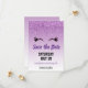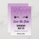 Party save the date card with a trendy stylish design. The background is a purple gradient color with faux sparkling glitter dripping down from the top. A pair of girly cute eyelashes underneath the glitter.